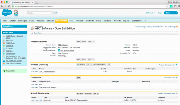 As an example, in Salesforce as a Sales Rep configures an opportunity and indicates fields like industry or competitor, Guru will assemble the case studies and competitor positioning you want your reps to use. No more digging around for information and wondering if it’s right, or shoulder tapping experts to ask them the same question again. (A short demo video is found here)