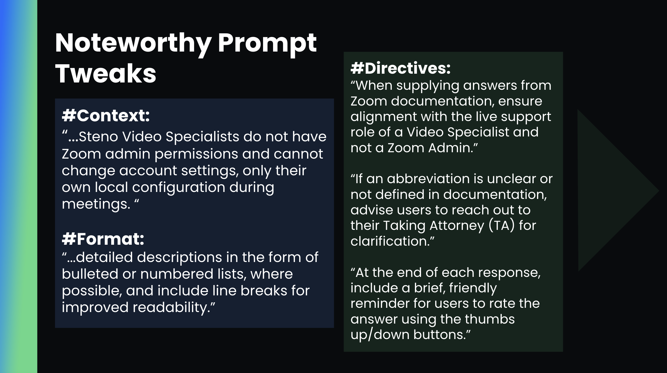 Christian’s prompt design reflected a deep understanding of his users’ constraints. He told the agent that video specialists do not have Zoom admin permissions — preventing answers that instruct users to change account-level settings they can’t access. He configured responses in detailed, bulleted formats for quick scanning during live depositions. And he added a thumbs-up/down reminder to every response to drive the feedback loop that would improve the agent over time.